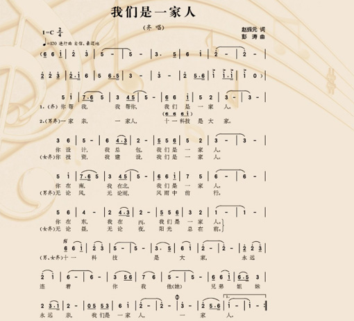 作曲:彭濤作詞:趙振元(一)你幫我,我?guī)湍?,我們是一家人。你設(shè)計(jì),我總包,我們是一家人。你在南,我在北,我們是一家人,你在東,我在西,我們是一家人。(二)一家親,一家人,十一科技是大家。你投資,我建設(shè),我們是一家人。無論風(fēng),無論雨,風(fēng)雨中前行。無論晝,無論夜,陽光總在前。(結(jié)尾)十一科技是大家,永遠(yuǎn)連著你我他(她),兄... [ 詳情 ]